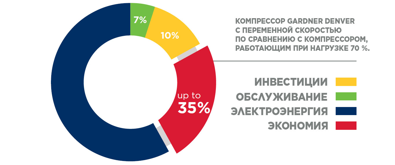 Компрессоры с переменной скоростью от Gardner Denver эффективно и надёжно справляются с переменным спросом на воздух, типичным для большинства систем сжатого воздуха на заводах. Годовые расходы на владение можно значительно снизить с помощью технологии переменной скорости.